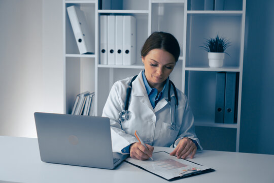 A dedicated healthcare professional analyzes patient information in a modern office, using advanced technology and documentation tools to ensure optimal care and safety for all patients