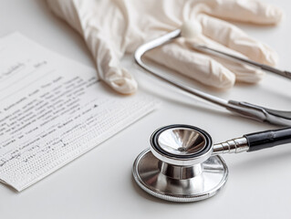 A stethoscope rests on a medical document beside a pair of white latex gloves, symbolizing healthcare, patient examination, and the importance of proper medical documentation and hygiene.