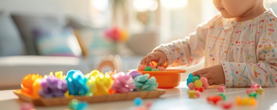 Child with Autism exploring sensory bins, occupational therapy, tactile engagement, colorful environment, focused activity, developmental support, inclusive care