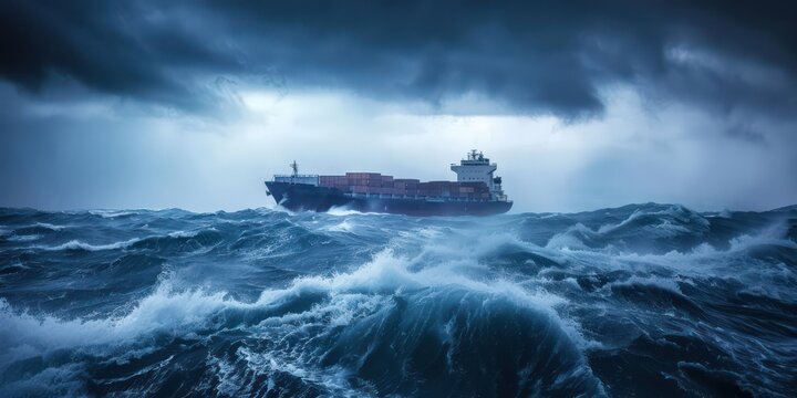 A dramatic photo of a container cargo freight ship braving stormy seas, emphasizing the resilience and strength of maritime transportation.