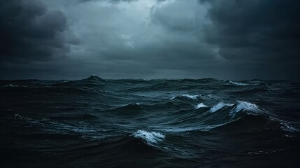 Horror-inspired black and blue sky with haunted clouds over a terrifying ocean, evoking a depression background. Mystery gloomy dark theme enhanced by blur texture, generated through AI