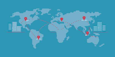 Global business connections and logistics illustrated with a world map and city buildings