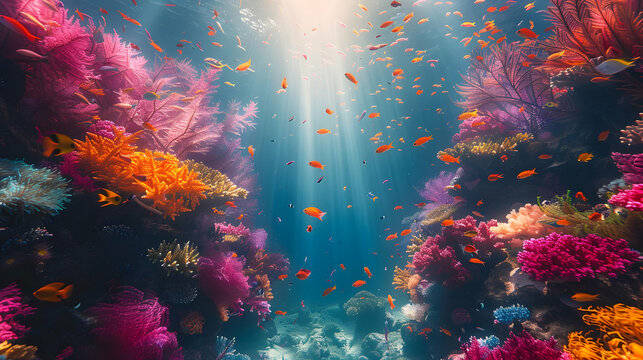 Explore the vibrant underwater world of a coral reef, teeming with colorful marine life and stunning coral formations. A breathtaking glimpse into oceanic beauty.