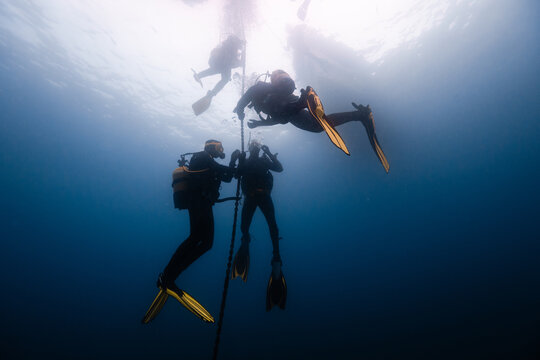 Unrecognizable divers in calm blue water