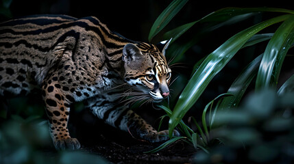 An ocelot at night, photographed using low-light settings to capture its stealthy hunt, set against a darkened forest floor background with copy space