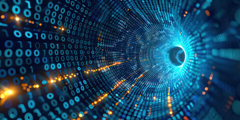 Abstract digital background with swirling binary code and glowing light.