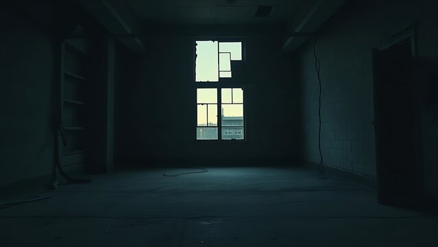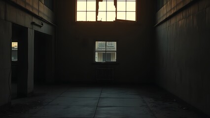 oligarchy. Urban ruin at dusk with soft light through a broken window onto a dusty floor. real-estate listings.