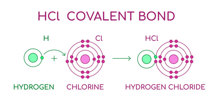 HCl Hydrogen Chloride covalent bond. Diatomic molecule, consisting of a hydrogen atom H and a chlorine atom Cl. Hydrochloric acid in a liquid state. Lewis atomic structure. Vector illustration.