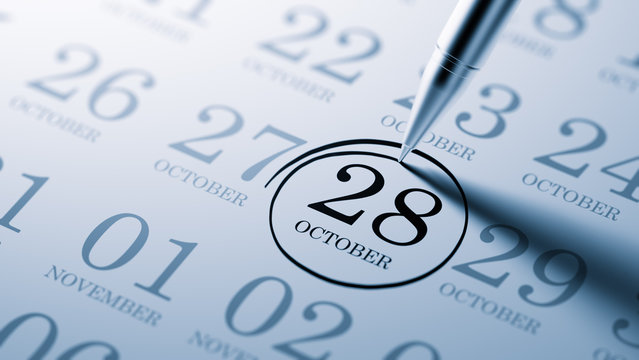 3d rendering of important days concept. October 28th. Day 28 of month. Red date written and pinned on a calendar. Autumn month, day of the year. Remind you an important event or possibility.