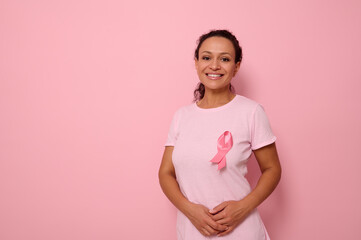 Smiling mixed race woman in pink T-shirt with pink satin ribbon symbolizing International Breast Cancer Day, expressing solidarity and support for breast cancer patients and survivors. 1 st october