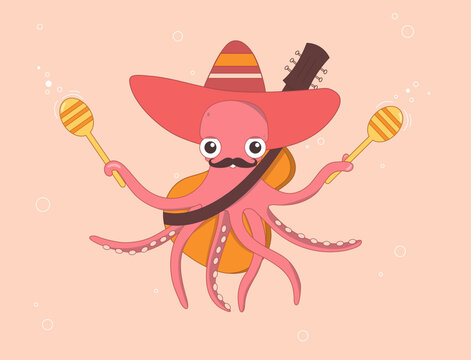 Funny Cartoon Pink Octopus with Drum Kit and Guitars in a Vibrant Musical Scene