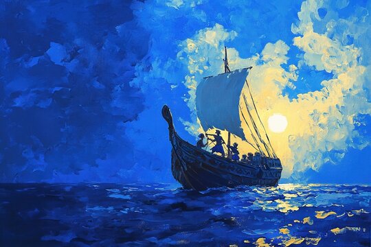 A stunning painting of a Odyssey ship sailing under a bright moonlit sky. Generative AI