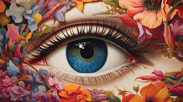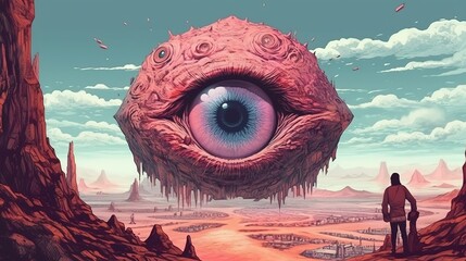 The Eye of the Beholder: A surreal and captivating abstract artwork featuring a giant eye peering through a swirling landscape of clouds and sand dunes, symbolizing perception, perspective.
