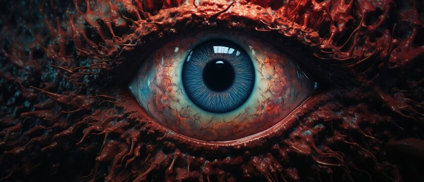 Surreal creepy bulging blue eye with bloody veins opening from rotting flesh, scary all seeing beholder, demonic big brother keeping watch, horror stalker - generative AI