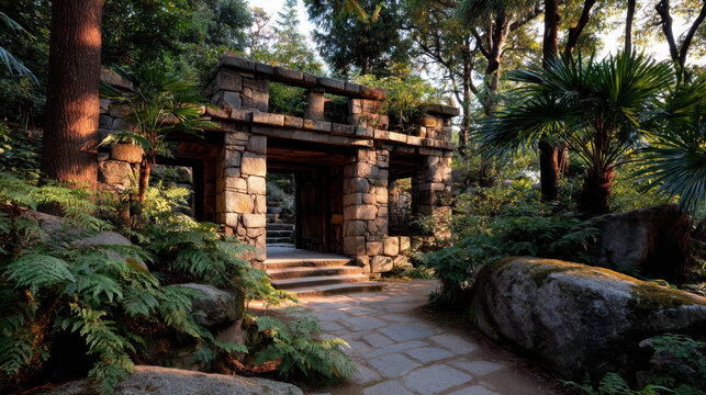 Serene path leads off beaten path to ancient temple surrounded by lush greenery and towering trees, inviting exploration and tranquility