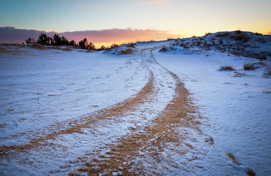 ATV auto sport track at winter. Wheel sandy tracks on snow