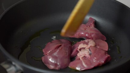 Cooking chicken liver in a pan on the stove. Preparation of offal