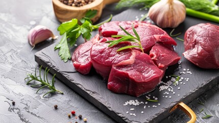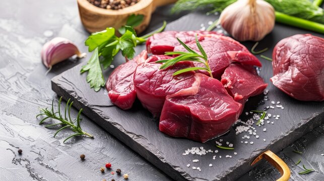 Freshly prepared beef heart offal on a cutting board, detailed texture, vibrant red color, kitchen setting, culinary focus