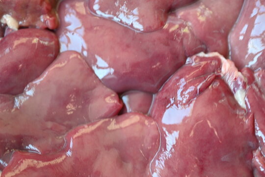 Raw fresh chicken or turkey liver, internal offal of poultry. Raw chicken liver
