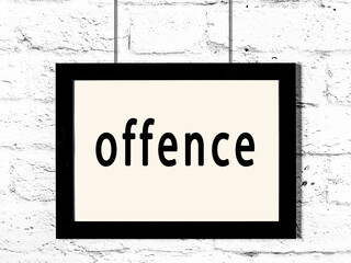 Black frame hanging on white brick wall with inscription offence