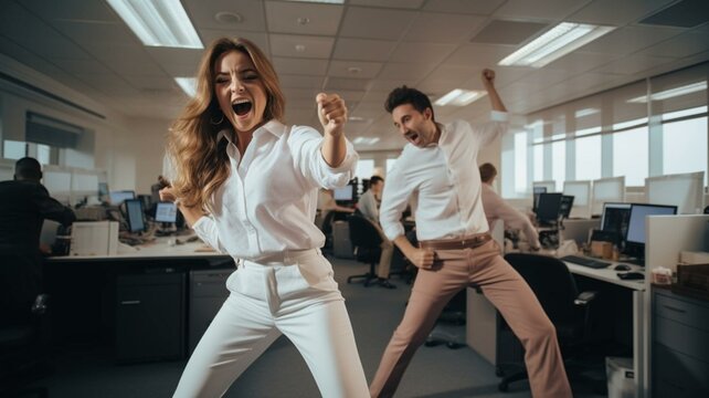 Euphoric interracial group of office co-workers celebrating success at work, dancing fun together rejoicing victory. Business people. Corporate staff. Party. Celebration.