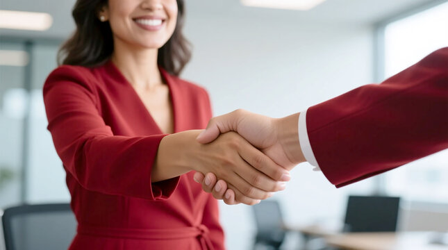 Two professional women greeting each other with handshake and starting a collaboration in modern office