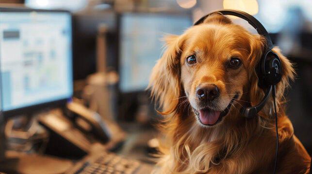 A cute dog in an office setting, answering calls in a busy call center. Generative AI