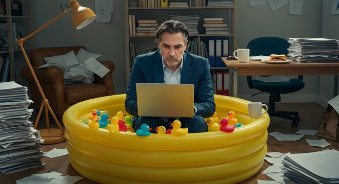 Businessman working in kiddie pool with rubber ducks funny office situation work from home concept