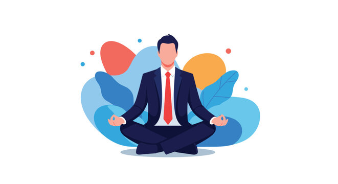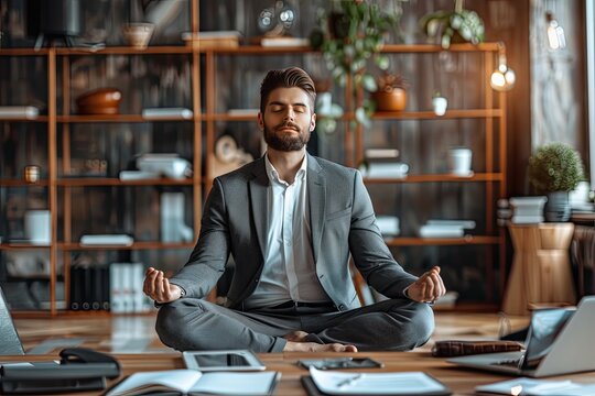 Businessman in a suit meditating in the lotus position to find balance and relieve stress from corporate office work life.