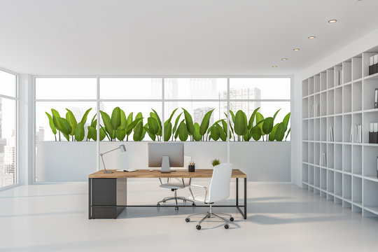 Office desk or table with office chair and computer. Business interior design elements. Vector illustration.