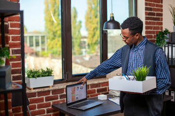 Businessman carrying work belongings and closing his laptop on desk, preparing to leave the office. Professional manager with box in hand, ready to end the day, shutting off his personal computer.