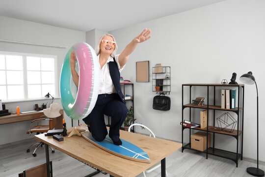 Mature businesswoman with swim ring and surfboard on table ready for summer vacation in office