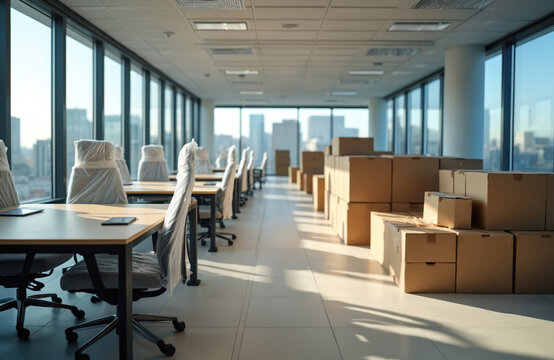 Modern office prepared for moving with packed furniture. Chairs wrapped in plastic, empty tables ready for transport. Stacked cardboard boxes await moving service. Corporate space during business