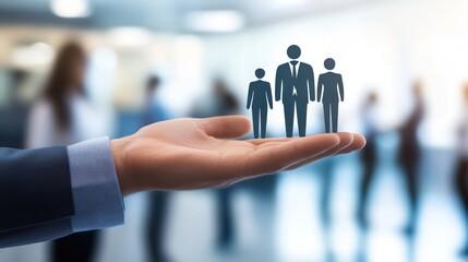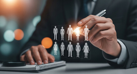 Man in suit selecting a person from a group of icons with a pen on a desk with a notebook nearby