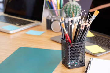 Stylish workspace with desktop computer, office supplies, houseplant and books at office. desk work concept.