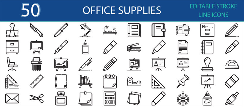 Editable stroke icon set of office supplies and stationery tools. Includes pen, pencil, ruler, notebook, binder, scissors, glue, desk, folder, envelope, lamp, board, and calculator for business use.