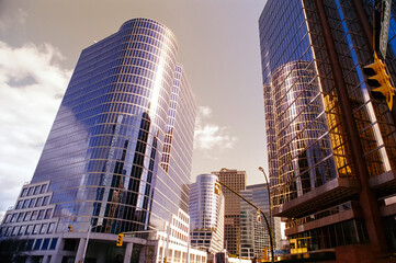 Modern skyscrapers and glass office buildings in business district, captured from low angle perspective with blue sky, symbolizing architecture, urban growth, corporate success, and city development.