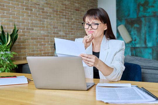 Postal advertising, promotion. Mature woman reads a letter at home. Corporate reply by mail.