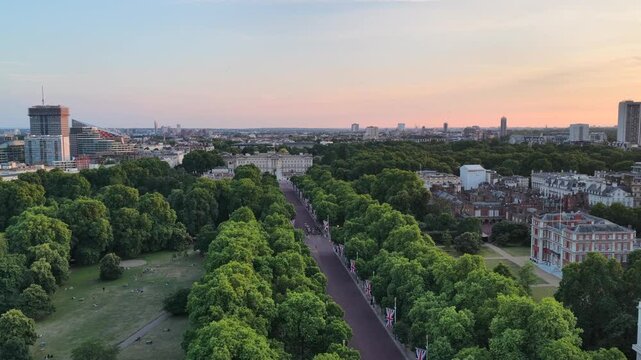 4K Aerial of Buckingham Palace, in London, UK in June 2025.