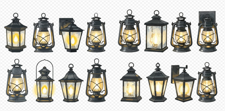 Vintage Lanterns and Candle Engraved Black and White Illustration of Three Different Kinds of Lamps