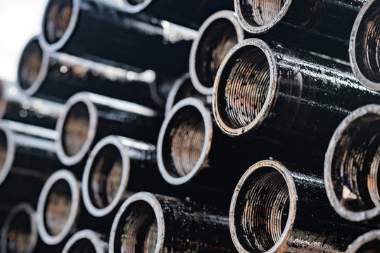 Drilling of oil and gas wells. Drill pipe inspection. Tubing for oil and gas listed on the pedestal out of the wells after washing and ready for inspection. Stack of casing laying on the deck.