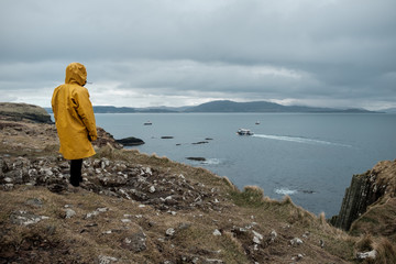 Woman with yellow oilskin jacket observing a boat from Staffa Island in Scotland