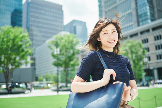 パソコンを持ってオフィスの廊下を歩くビジネスウーマン 転職や採用などの明るいイメージに