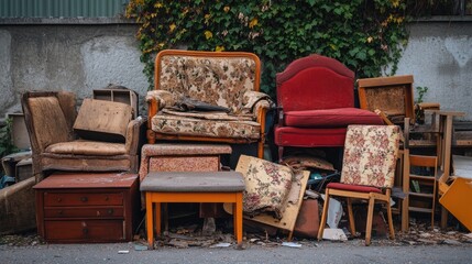 A pile of old furniture waiting to be donated.