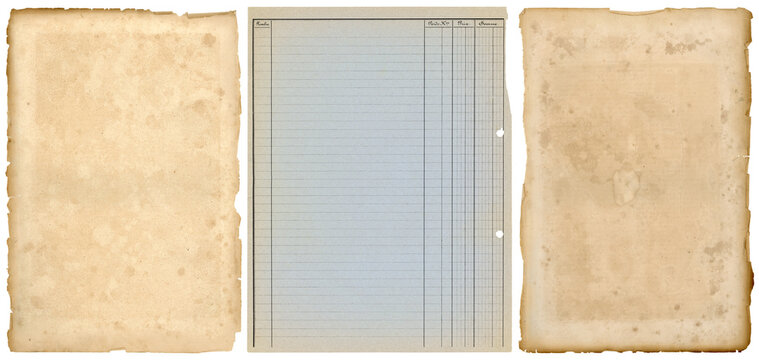 three vintage and antique paper textures, stained g with ripped / torn edges and old French ledger paper isolated on white a background, blank textured sheets as backgrounds or collage design elements