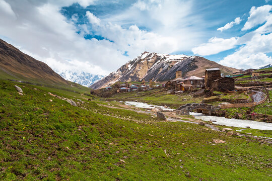 Georgia, Svaneti, Ushguli, Medieval village on bank ofÔøΩEnguriÔøΩRiver