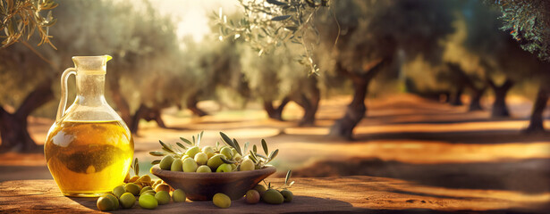 golden olive oil bottles with olives leaves and fruits setup in the middle of rural olive field with morning sunshine as wide banner with copyspace area - Generative AI