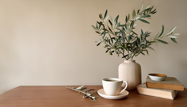 Breakfast scandi indoor interior still life Minimal home design concept Beige ceramic vase with olive tree branches Cup of coffee tea on wooden table desk with old books Empty beige wa : Generative AI