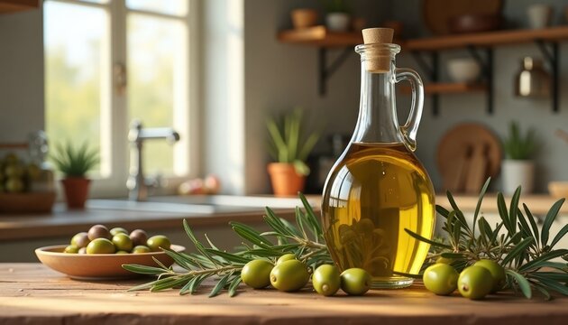 Freshly harvested olives, olive branches sit on wooden table in kitchen. Glass bottle of olive oil, bowl of olives displayed together. Setting evokes autumn harvest festival. Kitchen interior with