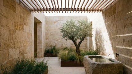 Tranquil Courtyard Oasis with Ancient Olive Tree and Stone Water Feature